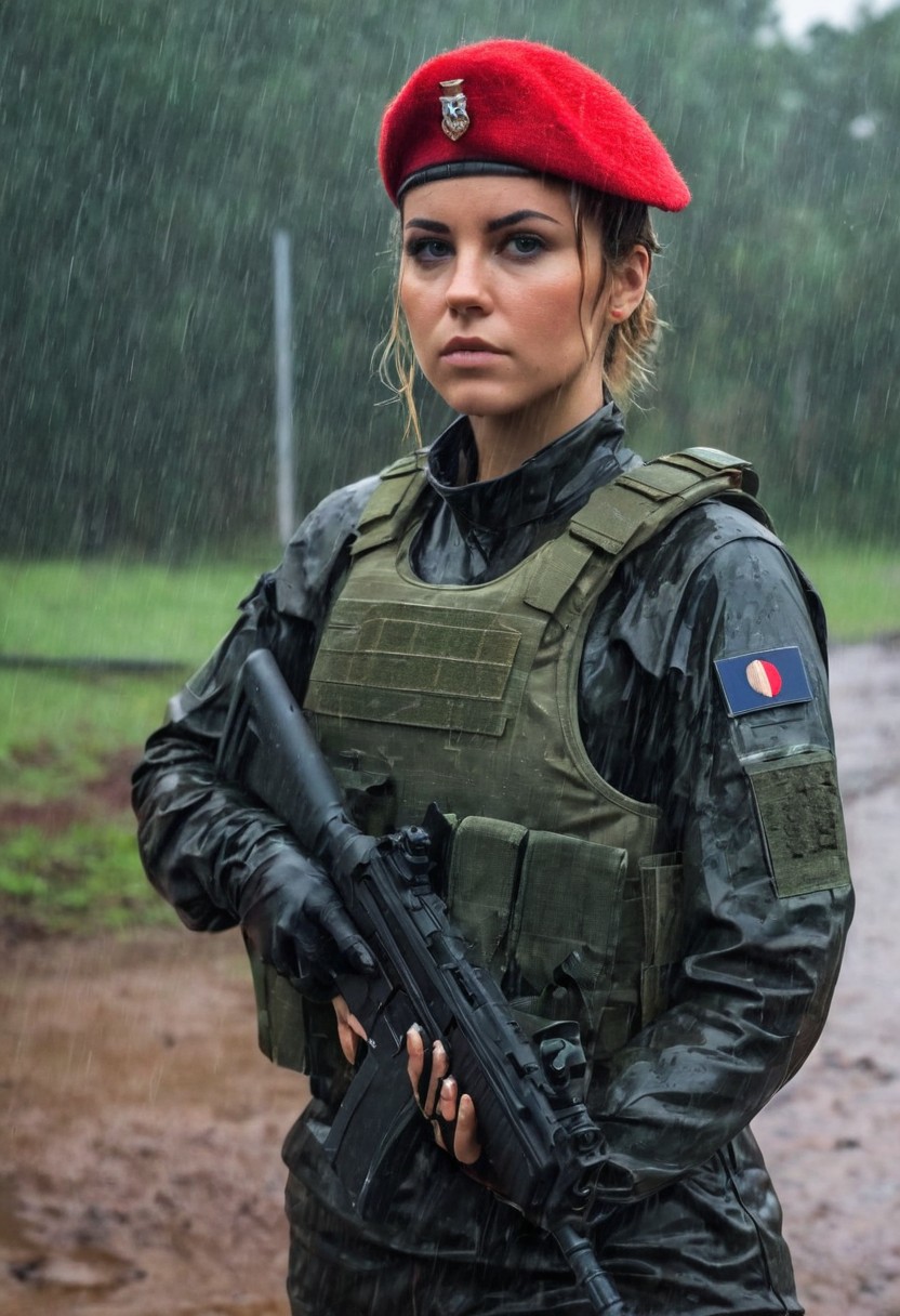 French, french badge, female soldier, messy bun, mp5, black bulletproof vest, camo military fatigues, red military beret, outdoors, barracks, serious gaze, heavy rain, wet clothes, wet hair