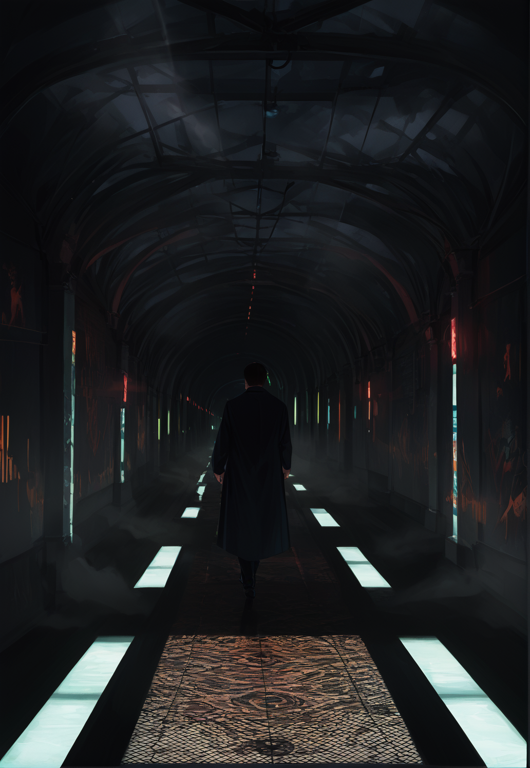 score_9, score_8_up, score_7_up, (4k quality, masterpiece):1.4), c0l0urgl0w, 43stl1ght1ng, f3nn3r, (best quality:1.1), digital painting, Silhouette, man standing in the middle of a tunnel with graffiti on the walls and floor, standing in the dark, glowing neon shine eyes, detailed face, in a futuristic spaceship tunnel, depicted as a scifi scene, spaceship hallway, liminal space hallway, in a space horror setting, sci - fi film still, stood in a tunnel, nighttime, occult cyberpunk, glowing neon colors, 50 mm lens, black hair, straight hair, <lora:c0l0urgl0wXLP:1.2> ,<lora:gl1tchXLP:0.8> gl1tch, haze lighting, low light, lined lighting, light particles, ((neon lighting through windows):2), windows on the floor, cloudy_sky, ((neon glow rays break through the windows in the floor):2), ((fog on the floor):2), fog creeps on the floor, neon through fog, fog, high-contrast, rim lighting, <lora:4rc4n3XLP:0.6> 4rc4n3 <lora:add-detail-xl:1> <lora:Vivid_Neon_Mess_Style_PONY:1> <lora:f3nn3rXLP:0.4> <lora:43stl1ght1ngXLP2:1> <lora:V3n3t14nXLP:1.4> v3n3t14n <lora:fog_creatures_v4:1> mdfg <lora:cloudy_fashion:1> cloud, smoke
