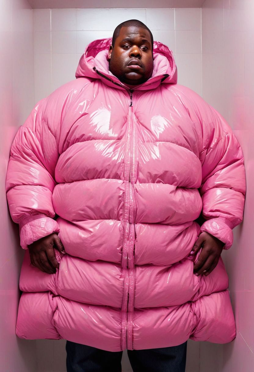 Full body wide angle image of an obese black man wrapped tightly in a thick pink winter jacket, the pink puffy jackets sleeves are long and wrap around his body, it is a tight straitjacket, bondage, str41tj4ck3t , helpless, in a pink padded cell, crazy, sweating, humid, steamy, wet skin
