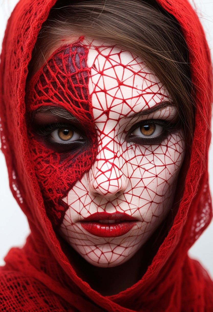 Close-up face, mysterious silhouette of an exotic girl in worn down clothing, red cosmetic over face goddess, alluring, by Minjae Lee, Carne Griffiths, Emily Kell, Steve McCurry, Geoffroy Thoorens, Aaron Horkey, Jordan Grimmer, Greg Rutkowski, amazing depth, double exposure, surreal, geometric patterns, intricately detailed, bokeh, perfect balanced, deep fine borders, artistic photorealism , smooth, great masterwork by Suiras <lora:add-detail-xl:2> <lora:Double_Exposure:0.5>