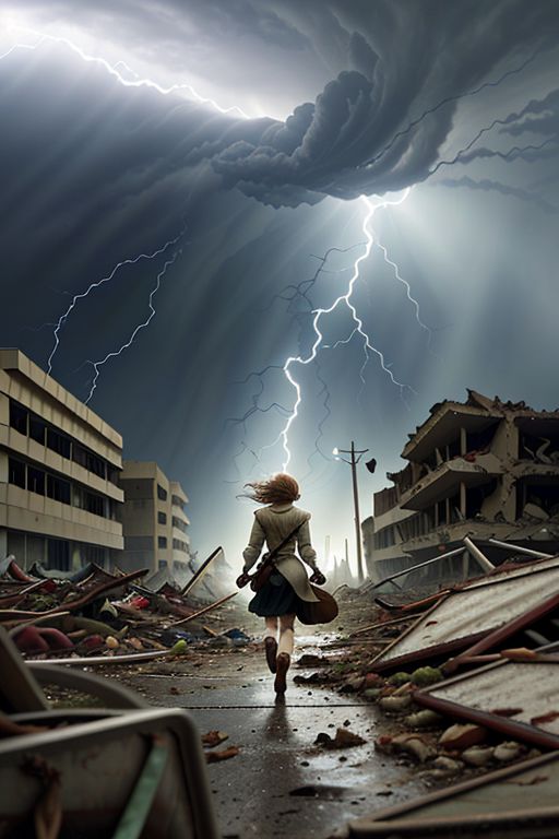 a female walking on the (rubble of a destroyed city under a (massive tornado)), demolished buildings and crashed cars, a lot rubble covering the streets and flying around BREAK CHSNGN, at day time in a storm, cinematic look, sun rays, lens flare, intrincate details, ultra realistic, sharp focus