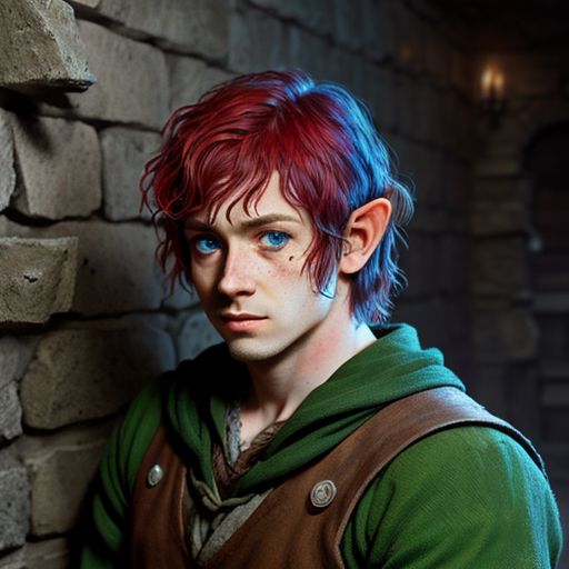 An Aloof male robber hobbit with Blue eyes, Red hair, ruddy Normal skin , sharp nose, and Freckles, colorful clothing, art by jock sturges and el greco in a dungeon