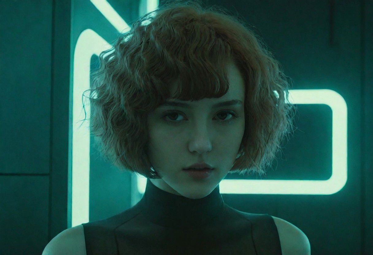 cyborg young woman, dark cyberpunk, pale fragile delicate body, frizzy bob cut hair, minimal cyberware, cinematic scene, cinematic lighting, analog style photo, grainy amateur lo-fi photo, desaturated colors, low contrast