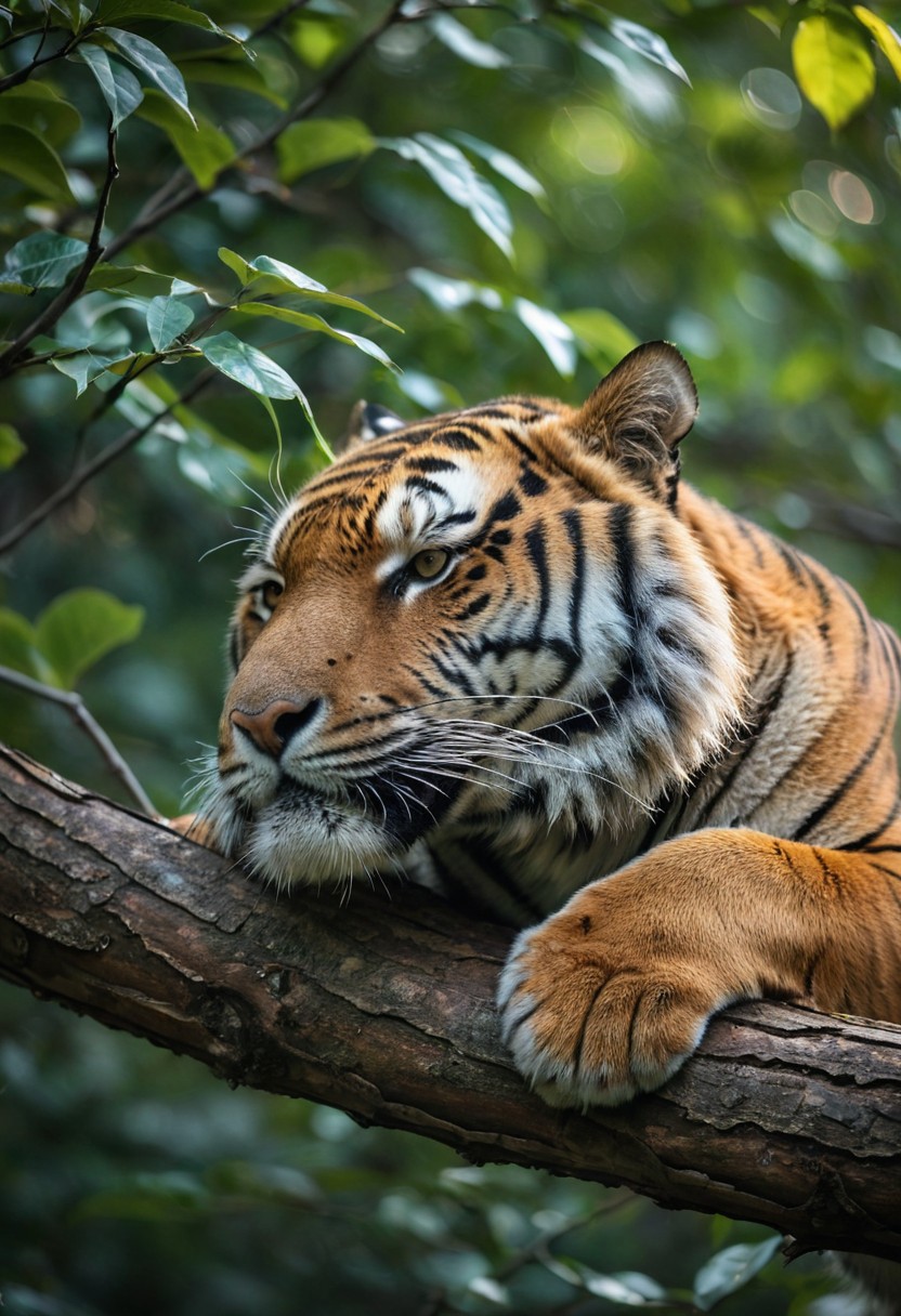 TREE branch in closeup, tiger sleeping, Fujifilm, moody color grading, ETERNA COLOR GRADING, AESTHETIC IMAGE, filter.DOF. cinematic, still, artistic. striking details of swirling photographed on a Sony A7R IV, 18mm F/1.7 cine lens, (highly detailed, intricately detailed), 8k, HDR,(volumetric lighting), (dynamic lighiting), , real shadows, intricate detail, photorealistic DOF. cinematic, still, artistic. striking details of swirling bokeh,depth of field.Helios 44-2 is 49mm., swirling bokeh