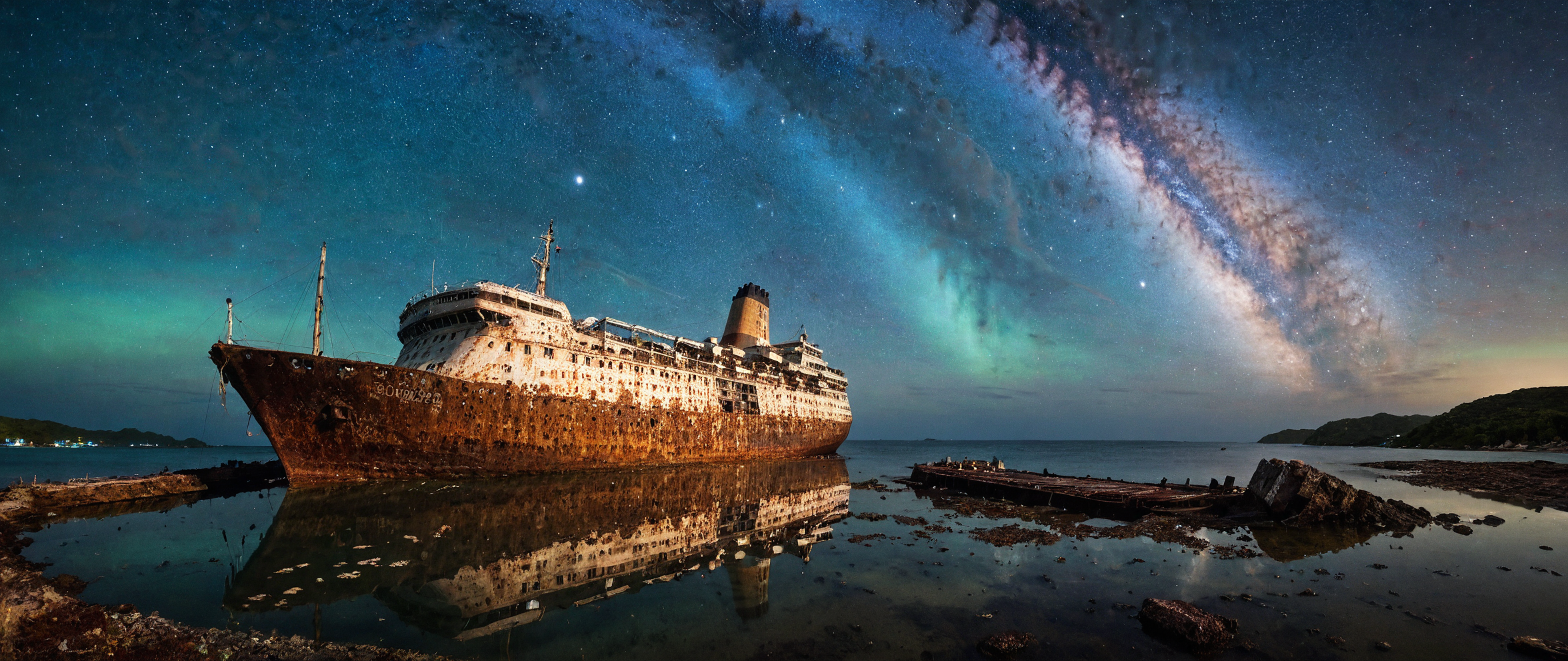 perfection style, detailed, realism, style, photograph, photo, <lora:detailed_notrigger:1.2> <lora:add-detail-xl:1.2> photo, of a rusted abandoned cruise ship, in shallow water, shipwrecked, listing to one side, reflections on the calm water, night time, milky way sky, clear sky, stars, moonless night, ambient light, faded paint, rusted, broken, abandoned <lora:corrosion:0.75>, in a Caribbean bay, melancholic atmosphere, sad atmosphere