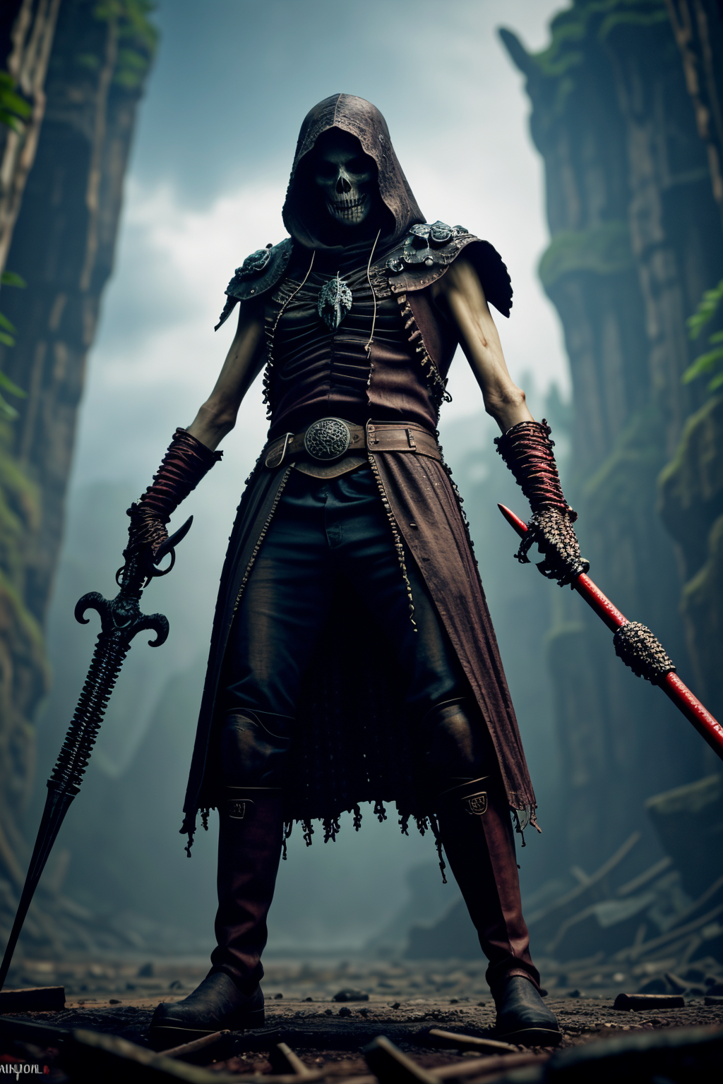 <lora:LCM_LoRA_Weights_SD15:1>,<lora:detail_slider_v4:1.1>,(deathly skeleton) warlord, glowing red eyes, , wearing Tattered cloak, rusted chainmail, bone crown, ancient shield, decayed gauntlets, iron boots, holding wielding ancient mace, set in the cursed lands, in an ancient skeletal cave, filled with stalactites and stalagmites, echoing with the distant sound of dripping water , at night,