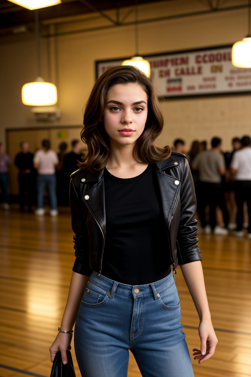 <lora:LCM_LoRA_Weights_SD15:1>,<lora:detail_slider_v4:1.1>,(confident greaser) young woman, Average build, extra long brown hair, african, dark skin, light brown eyes, pompadour, wearing a brown fitted black t-shirt, denim pants, converse sneakers, leather jacket, set in the 1950s, in a nostalgic school dance, with dim lighting, retro decorations, slow dancing, and a romantic atmosphere , at night,