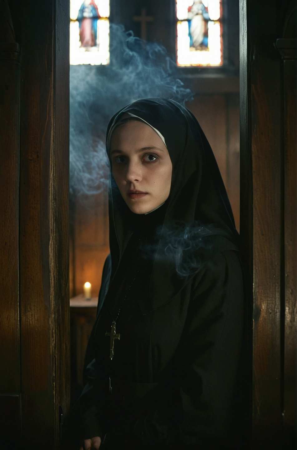 RAW photo, in distance, 25 year-old nun (in dark gothic confessional booth, peeking, slightly scared):1.3, clear-cut face, perfect teeth, award winning, 8k, natural lighting, analog film, detailed skin, amazing composition, darkdetails, subsurface scattering, filmic, chiaroscuro, soft light, supernatural, velus hairs, smoke in church, <lora:add-detail-xl:1> <lora:zavy-cntrst-sdxl:1.3> <lora:MJ52:0.4> <lora:Three-quarter view style:1> Three-quarter view style