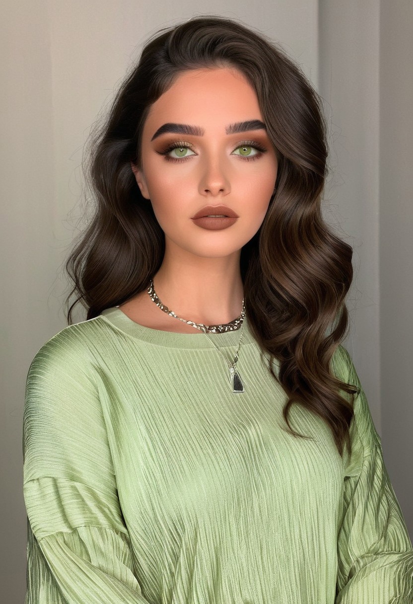 The image features a young woman with striking features and a flawless complexion. She has long, wavy brown hair that cascades over her shoulders. Her eyes are a captivating shade of green, accentuated by well-defined eyebrows and subtle eye makeup. Her lips are full and glossy, and she is wearing a soft, natural-colored lipstick. She is dressed in a beige top and adorned with a delicate, silver necklace with a small pendant, which adds a touch of elegance to her overall look. The background is room stand soft full body