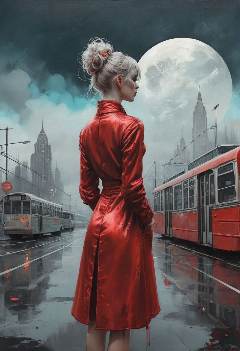 old book style ink illustration, on parchment, ink splashes, ink stains, ink smears, faded ink, a painting of a young woman in oversized satin red outfit, pale skin, big breasts, slim body, very short hair, messy hair, pixie hairstyle, straight hair, cyan hair, grey eyes, deep background, a digital painting, by Justin Gerard, tumblr, dan mumford tom bagshaw, 64x64, on street, writing on a wall with a spray, cute detailed digital art, painting of beautiful, very stylized, hildebrandt, beautiful deep colours, bus station, glass, fog, moon, in the clouds, skyscrapers, futuristic transport, fractals, night, gloomy tones,mentixis, linquivera