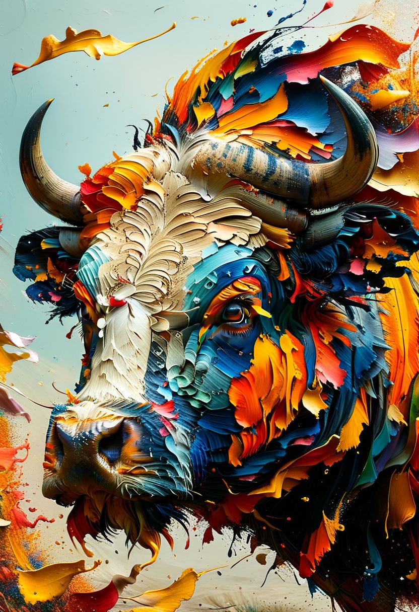 This vibrant, eye-catching image presents a captivating and boldly stylized depiction of a buffalo or bull. The use of vivid, contrasting colors - the fiery orange and red hues against the rich, earthy tones of the animal's fur - creates a striking, almost electric visual impact. The expressive, almost impressionistic brushwork lends a sense of movement and energy to the composition, giving the impression that the animal is alive and dynamic on the canvas. The bold, abstract patterns and textures that cover the buffalo's body add an intriguing layer of visual interest and depth. The centered composition, with the buffalo's head and horns filling the frame, draws the viewer's attention directly to the powerful, intense gaze of the animal. This direct eye contact creates a sense of engagement and connection between the viewer and the subject, inviting contemplation and interpretation. The overall impression is one of raw, primal power and energy, suggesting themes of strength, resilience, and the untamed essence of the natural world. This image could serve as a highly versatile prompt for a range of creative endeavors, from written narratives and poetic explorations to further artistic interpretations in various media. The vibrant, almost hallucinatory quality of the colors and the dynamic, . ral-drptpl