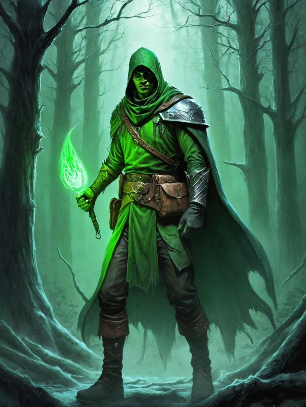 forgotten realms, male ranger, neon greenk fire light illumination, ghostly light, dark forest, night, cold light,