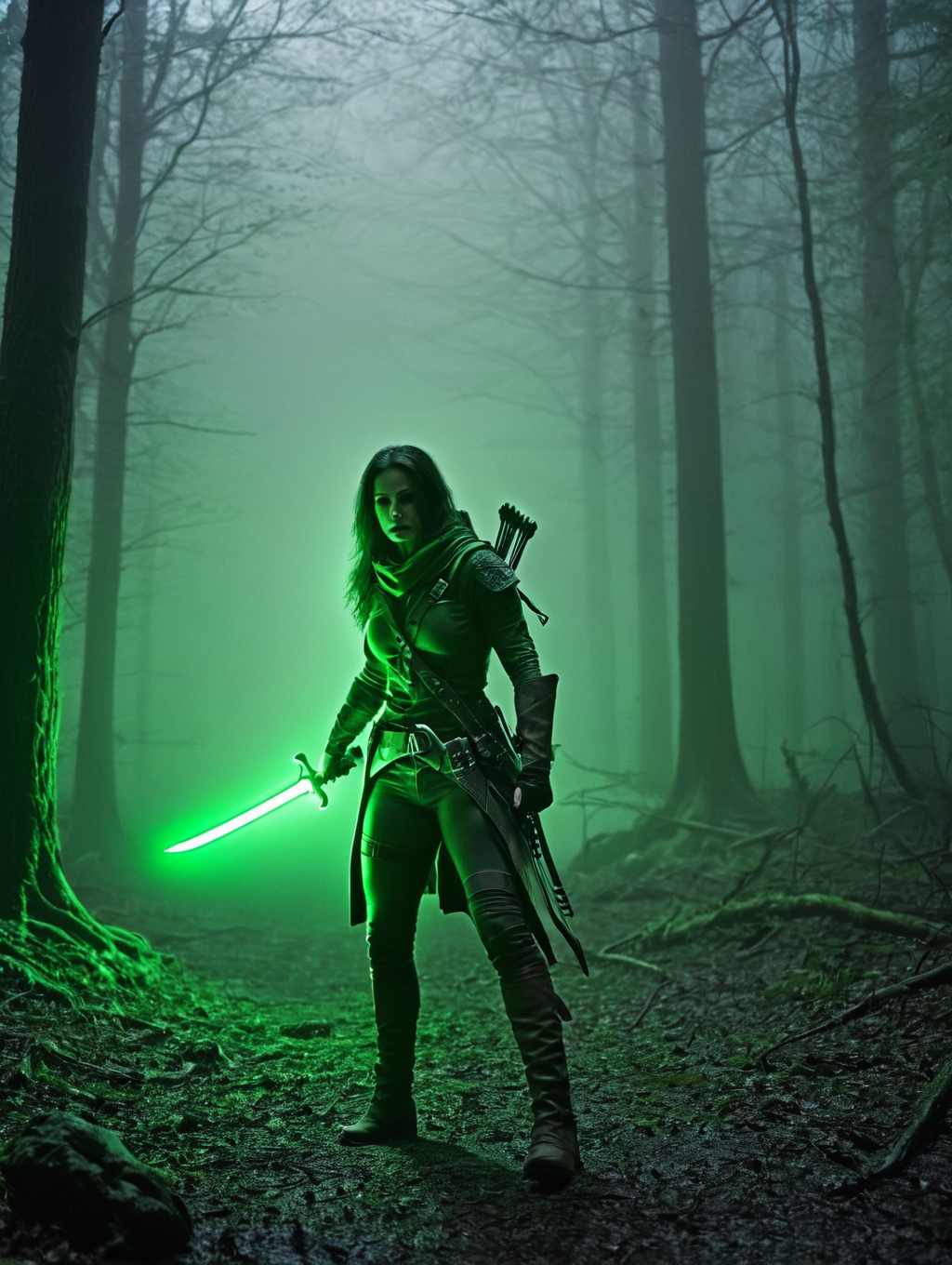 forgotten realms, female ranger, neon green light illumination, fog, ghostly light, dark forest, night, cold light,