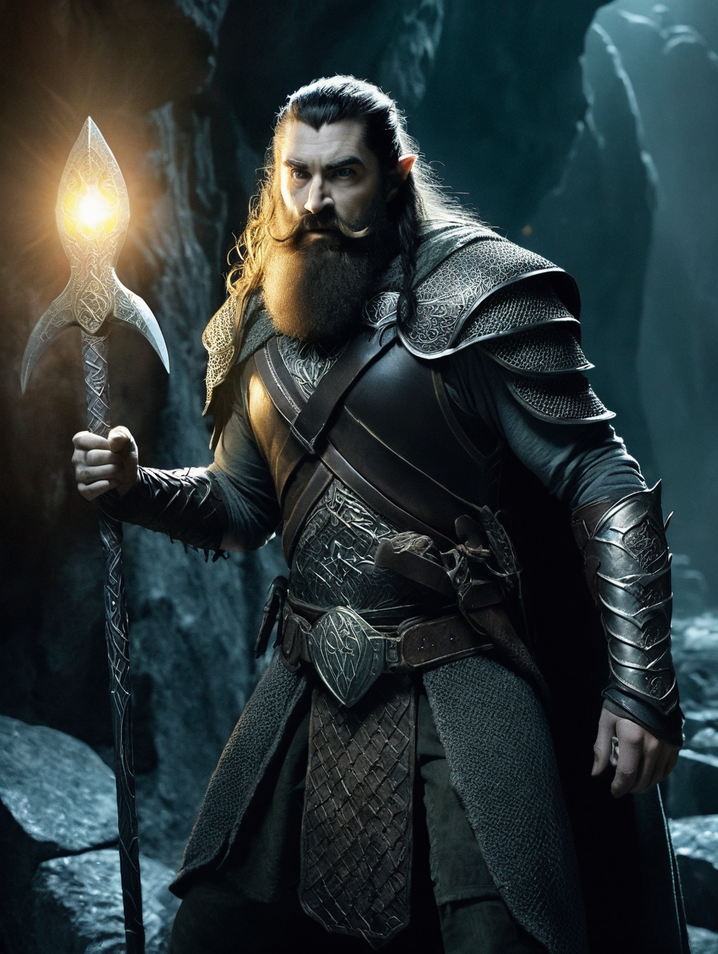 middle earth darven prince, braded beard, strong, battle axe, fire light illumination, ghostly light, dark caves, night, cold light,