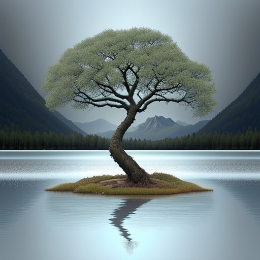 great magical tree growing from submerged out of lake on a snowy mountain, the tree is huge and the lower part is completely submerged, the tree gives off a powerful and mesmerizing magic