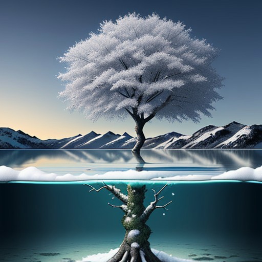 great magical tree growing from submerged out of lake on a snowy mountain, the tree is huge and the lower part is completely submerged, the tree gives off a powerful and mesmerizing magic