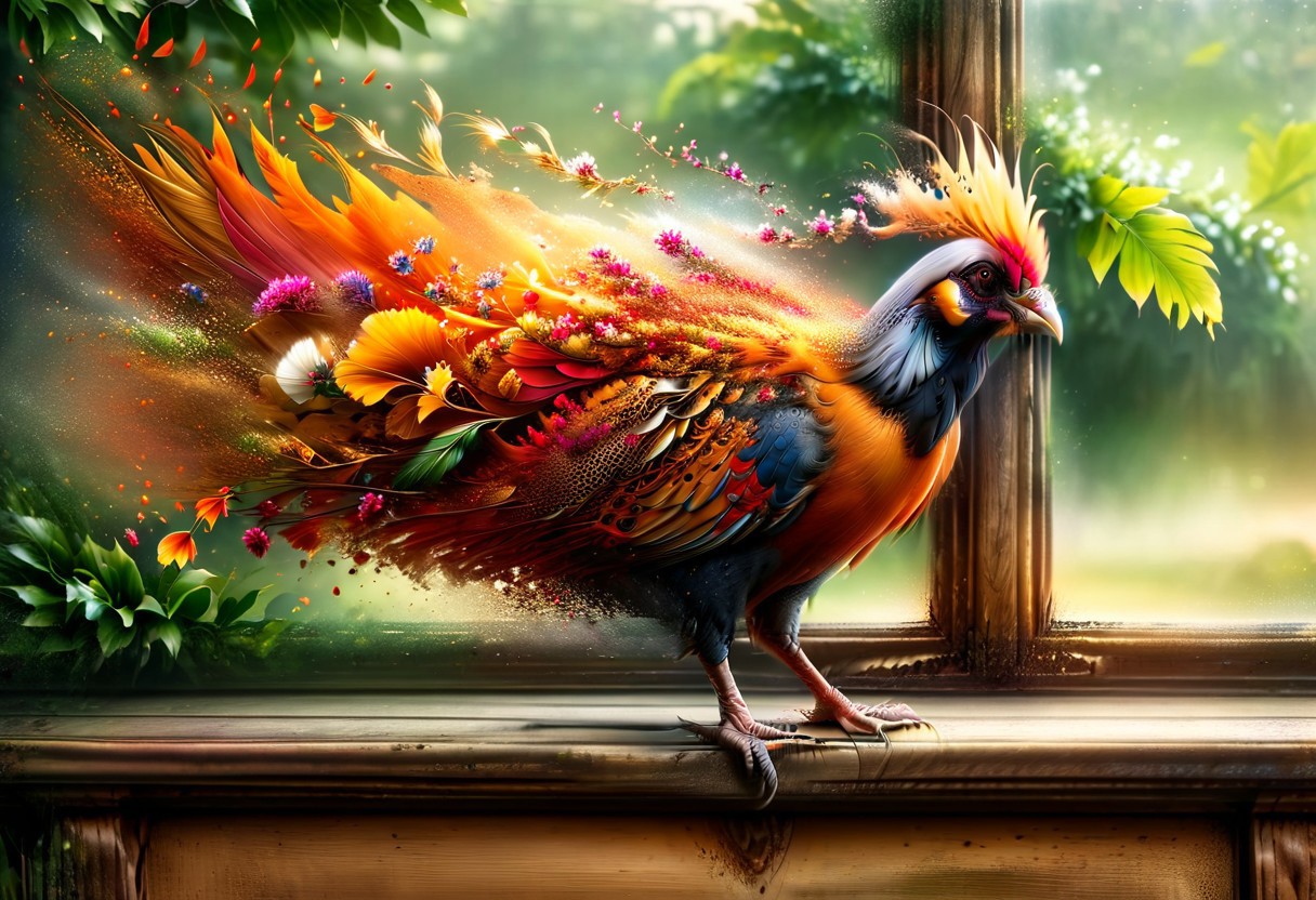 Create a mystical magazine cover featuring a stunning Golden Pheasant perched gracefully on a rustic window ledge. The bird showcases radiant gold and crimson plumage that stands out against the soft, natural light filtering through the glass. Surround the scene with lush greenery visible outside the window, illuminated by morning sunlight that casts a warm, golden glow. Capture this exotic moment using a Nikon D850 for vibrant details and a Fujifilm X-T4 for rich color. Include elements of a selfie and beautiful flowers to add charm to the composition.