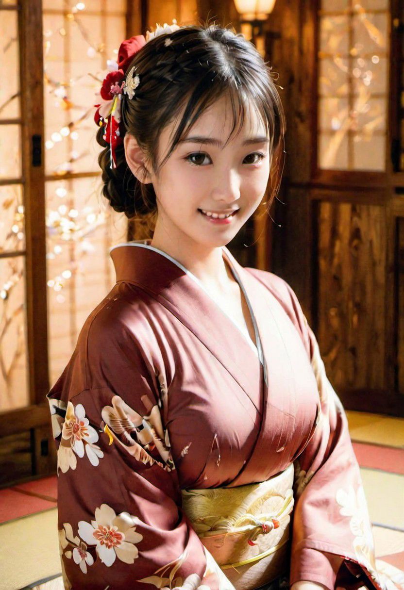 OverallDetail, (best quality, ultra-detailed, an extremely delicate and beautiful:1.2), (1girl, smile wavy mouth, twin braids hair, black hair, brown eyes, small breasts, brown kimono:1.3), (shiny clothes, kimono, shiny skin:1.5), (3d:1.1), (happy new year, japanese room, particle lighting, below wind, close-up, wariza:1.4)