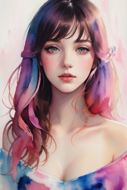(8k, best quality, masterpiece:1.2),(best quality:1.0), (ultra highres:1.0), watercolor, a beautiful woman, shoulder, hair ribbons, by agnes cecile, half body portrait, extremely luminous bright design, pastel colors, (ink:1.3), autumn lights