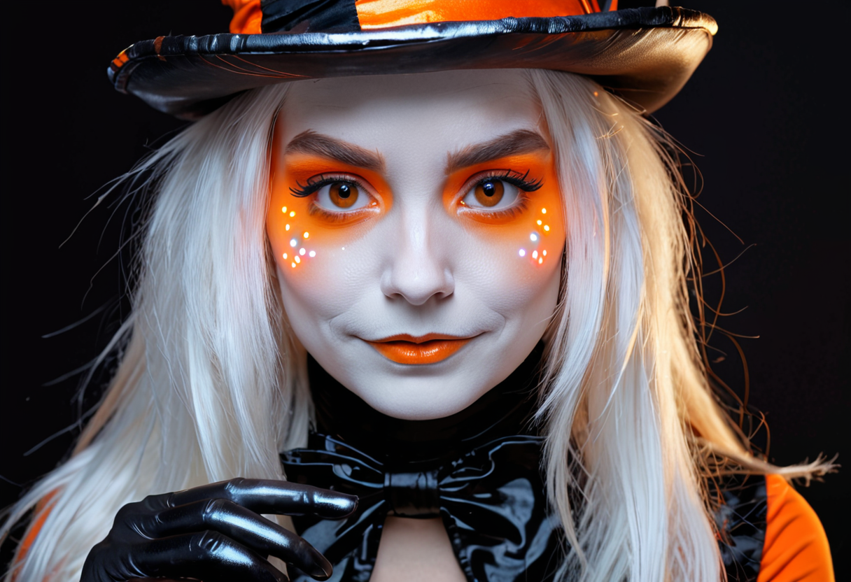 Bright, LED, eyes, gleam, with, artificial, intelligence, and, curiosity,Mad Hatter,body painting,high details,long,platinum,white,hair,orange,hair,warm,light,petite,female,Serridentines,turtleneck,bruise,squat,pose