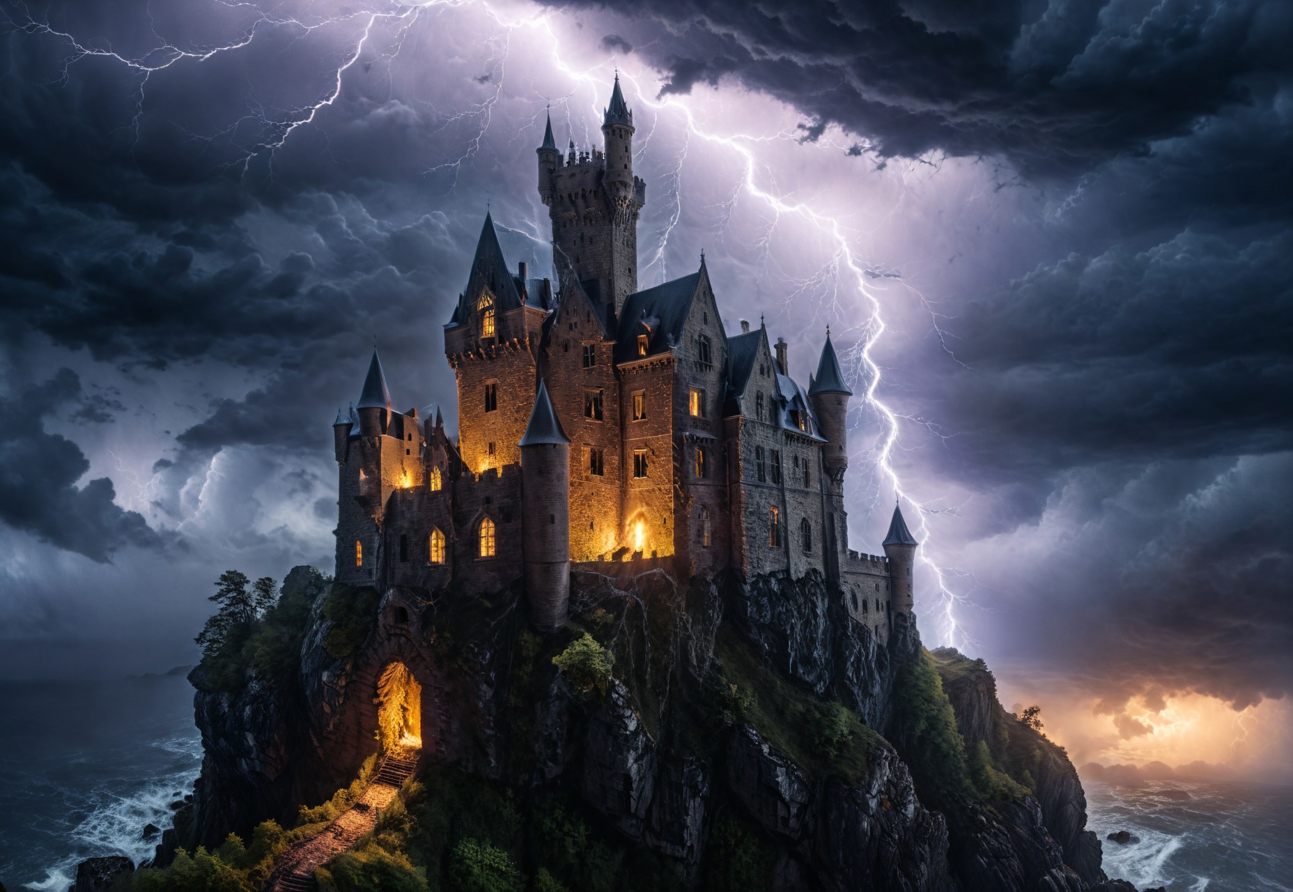 A towering, haunted castle perched on a cliff, with lightning illuminating the stormy night sky. Ghostly figures can be seen in the windows, and the air is thick with an ominous presence. Include a mysterious figure in front of the castle.