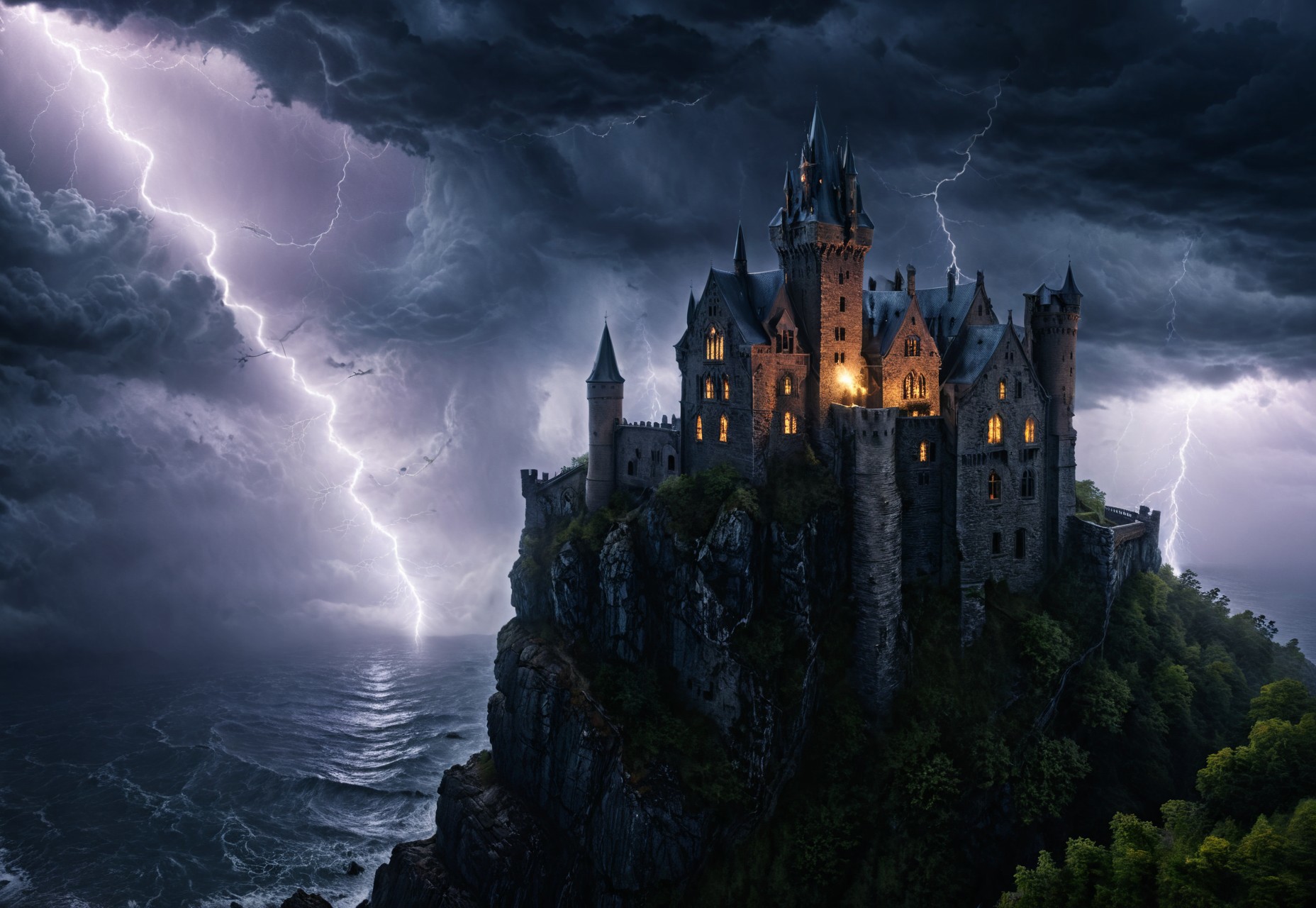 /imagine prompt: A towering, haunted castle perched on a cliff, with lightning illuminating the stormy night sky. Ghostly figures can be seen in the windows, and the air is thick with an ominous presence. --v 5 --ar 16:9 --q 2 --style horror