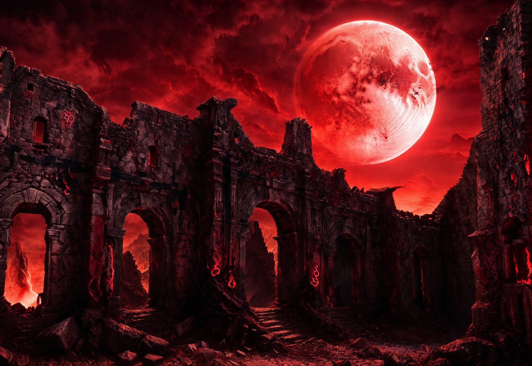 Ancient, crumbling ruins bathed in the red light of a blood moon, with top and bottom black bands to mimic widescreen format. Shadows of long-forgotten deities loom over the scene, with arcane symbols glowing faintly on the stone walls.