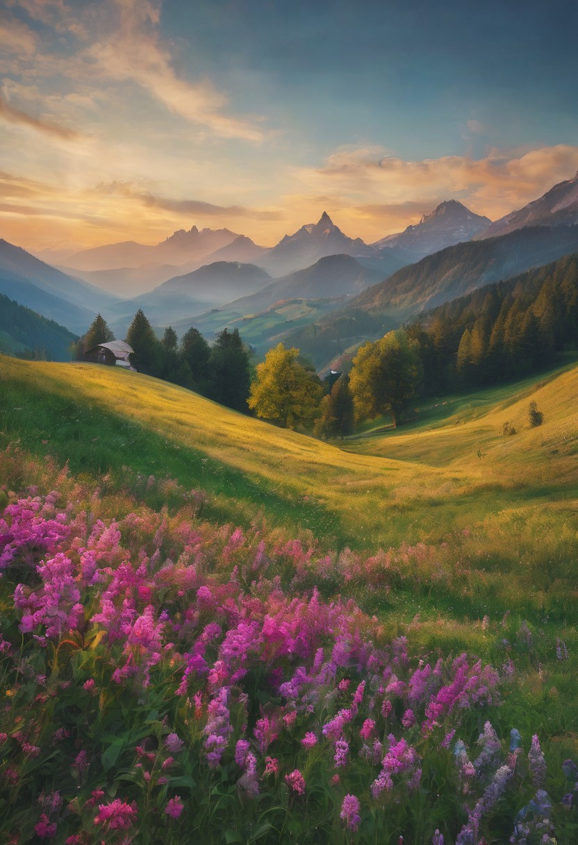 the hills of the Swiss Alps amidst a field of colorful beautiful flowers, Romantic setting, hyper modern, unique alps Style, a person sits peaceful in meditation facing the view, next to her is a closed leather bound book a beautiful unique crystal and a wicker basket with wild flowers bunched in it, all ornately placed on the ground, a magical Glow to it, the hills of the Swiss Alps amidst a field of colorful beautiful flowers, Romantic setting, hyper modern, beautiful classy classical timeless, unique hat of the opstyle of the alps, beautiful picturesque quaint legendary landscape, magical mist rolls in over the ground, NC, a feeling of Magic and wonder, magical lighting effects, slow shutter effect, , cinematic lighting, soft colorful lighting, star streaks, light trails, normal hand's, five finger's, masterpiece, best quality, highly detailed, sharp focus, dynamic lighting, vivid colors, texture detail, particle effects, storytelling elements, narrative flair, 8k, UE5, subject-background isolation