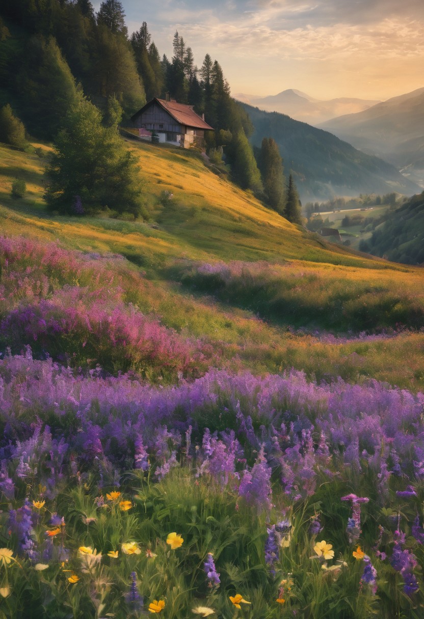 the hills of the Swiss Alps amidst a field of colorful beautiful flowers, Romantic setting, hyper modern, unique alps Style, a person sits peaceful in meditation facing the view, next to her is a closed leather bound book a beautiful unique crystal and a wicker basket with wild flowers bunched in it, all ornately placed on the ground, a magical Glow to it, the hills of the Swiss Alps amidst a field of colorful beautiful flowers, Romantic setting, hyper modern, beautiful classy classical timeless, unique hat of the opstyle of the alps, beautiful picturesque quaint legendary landscape, magical mist rolls in over the ground, NC, a feeling of Magic and wonder, magical lighting effects, slow shutter effect, , cinematic lighting, soft colorful lighting, star streaks, light trails, normal hand's, five finger's, masterpiece, best quality, highly detailed, sharp focus, dynamic lighting, vivid colors, texture detail, particle effects, storytelling elements, narrative flair, 8k, UE5, subject-background isolation
