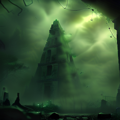 ArsGreenMistWorld, Bionic entity in the center, dark ominous pyramid in the back, green theme, green mist, dark fantasy horror