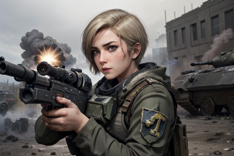 conysv3-1400, score_9, score_8<lora:warhammer 40k imperial guardsman:0.8> femboy warhammer 40k imperial guardsman, detailed face, perfect face, gothic ruins, gothic city, smoke plumes, tanks in background, blue eyes, blonde hair, short hair, very short hair, side shaved hair, side shaved, tired , dirty face, close up, face focus, aiming down sights, gun, aiming gun, shooting gun, firing lasgun, red laser, explosion in background, battlefield, battlefield background, cute face, cute girl face,