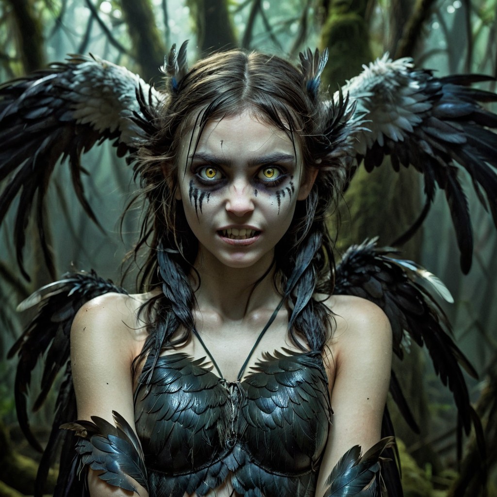 dim lighting, moonlit, harpy girl, hunkered, feathered skin, sharp teeth, scales, black eyes, stringy hair, bird wing arms, feathers in hair, neutral expression, inhuman, swampy