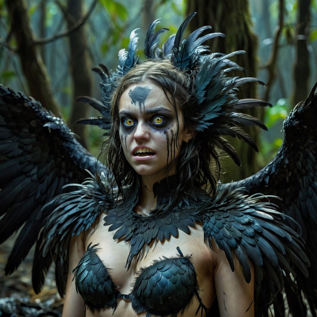 dim lighting, moonlit, harpy girl, hunkered, (feathered skin), sickly skin, (dirty skin), (((very sharp teeth))), scales, black eyes, stringy hair, ((big bird wings on back)), black feathers, feathers in hair, menacing expression, inhuman, monstrous, swampy