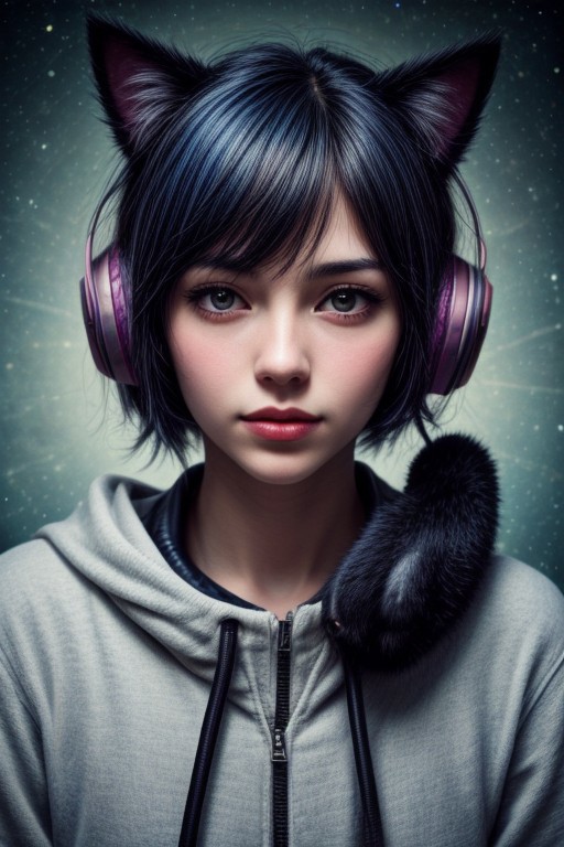 (masterpiece, best quality, highres:1.2), raw portrait photo of cute Girl with headphones, cat ear headphones, colored hair, in high detailed textured, (most iconic photo), (space background), depth of field, morbid, dynamic time, (light smile:0.3), SFW,