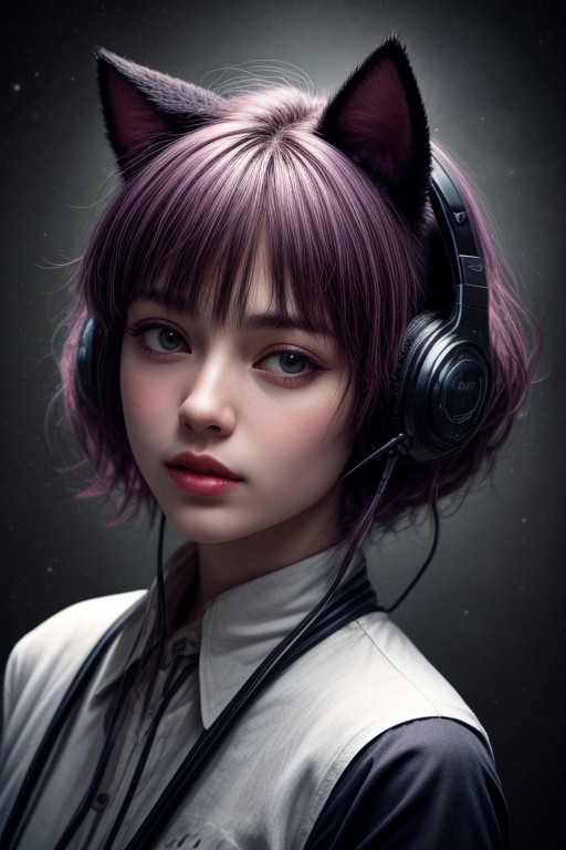 (masterpiece, best quality, highres:1.2), raw portrait photo of cute Girl with headphones, cat ear headphones, colored hair, in high detailed textured, (most iconic photo), (space background), depth of field, morbid, dynamic time, (light smile:0.3), SFW,