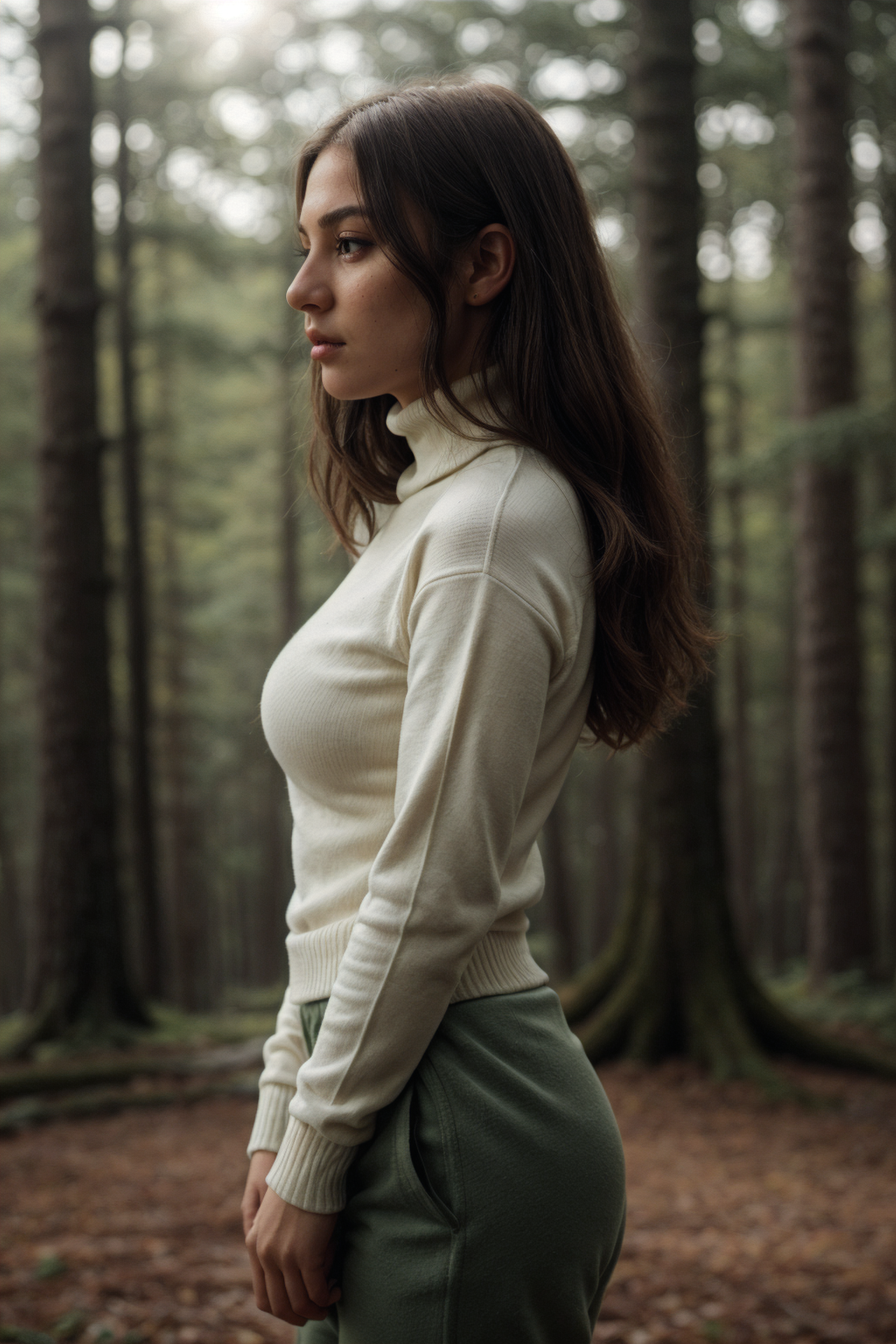 woman, over knee shot, front view, super cute woman, blonde hair, (White turtleneck sweater), (Green tracksuit bottoms), detailed face, slim, skin pores, skin fuzz, vellus hairs, subsurface scattering, pale skin, slim, hanging breasts, high heels, small breasts, pretty, green eyes, large ass, standing on rock, Mountainous, Forest, (spotlight, dark theme, silhouette), dramatic shadows and subtle highlights, warm tones, soft focus, atmospheric lens, SkinHairDetail, OverallDetail, epiCPhoto, fFaceDetail,<<lora:Background_Detail_v3:0.6> <lora:more_details:0.5> <lora:bgm-beta1a:0.1> <lora:breastsizeslideroffset:0.3> <lora:AloeVera_Thiccness_Slider:-0.5> <lora:perfect hands:1>