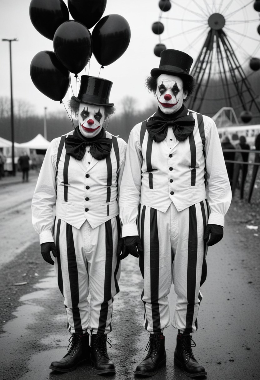 ((The saddest (ultra-sad-clowns), at the gloomy melancharnival worn down dilapidated old amusement park)), (tiny black tophats with the word "SAD" seen printed on the front) , (black and white clown makeup on their faces), (black and white striped clown costumes), (big black clownshoes), (deflated black balloons), (bourbon bottles), ((the saddest (ultra-sad-clowns) (wearing tiny black tophats with "SAD" legibly printed on the front in bold font) , (black and white clown makeup on their faces), (black and white striped clown costumes), (big black clownshoes), (are walking through a bleak and dilapidated old amusement park ) (carrying cheap bottles of bourbon and (deflated black balloons), [ ((double negatives) (/ low opacity overlays)), 16k, uhd, (( full-length) (/full body) photograph)), melancholy, bleak, dystopian, (faded colour splashes), (victorian goth style), (extremely detailed), (very detailed background), ( realisticvision-negative-embedding ), ( Photographer Martin Kimbell Style ) ]
