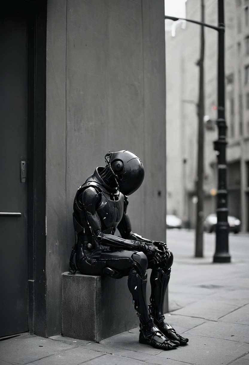 high-contrast monochrome palette, subtle grain, modern art photograph, noface cyborg sitting on a street corner panhandling, melancholy