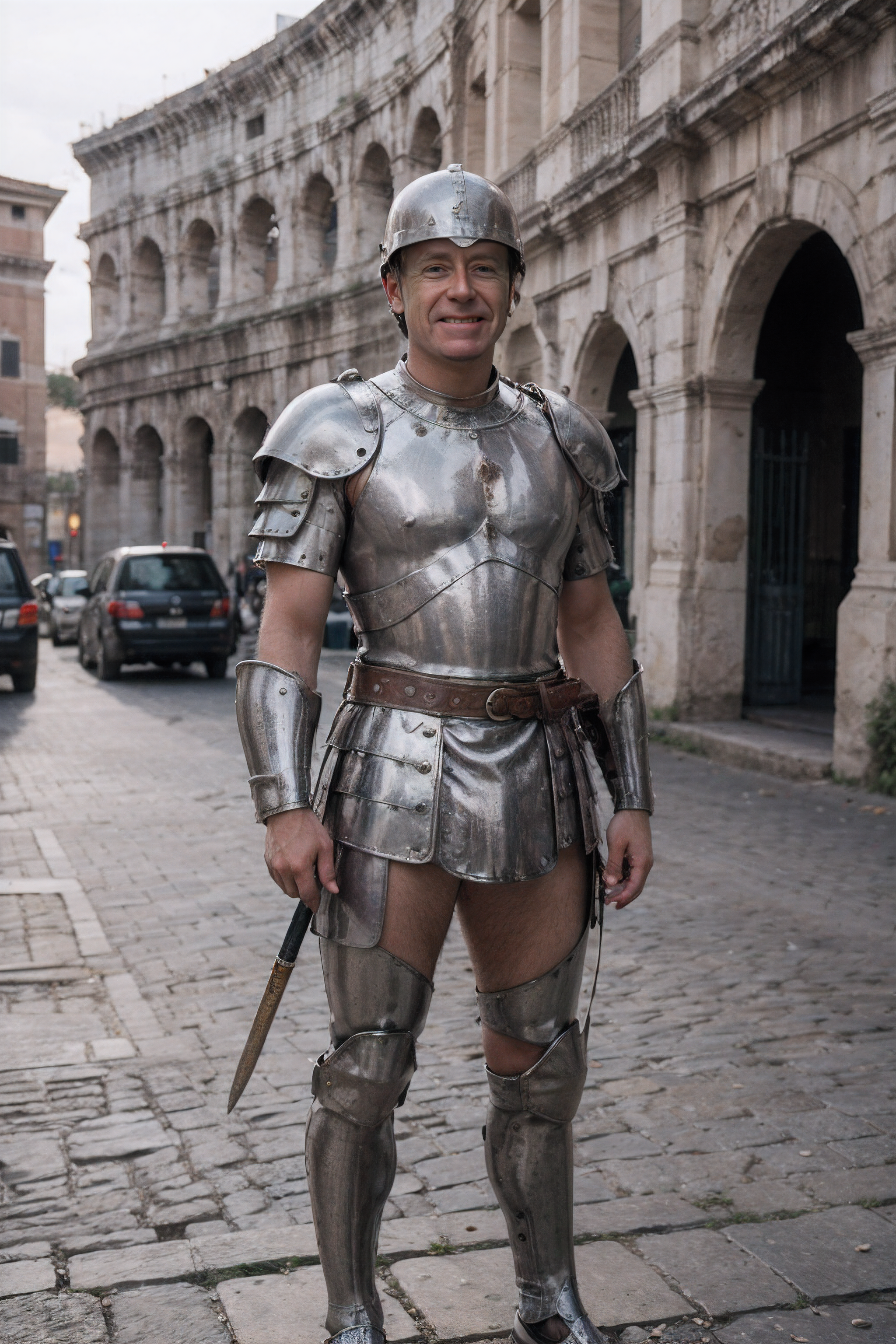 straight on, full body photography, RAW photo of a Roman male Soldier standing pose in front of Rome Coliseum, wearing full antique steel armor, roman centurion helmet, shield, spear, smiling, white teeth, highly detailed, intricate details, sharp details, skin textures, (short blond hair), hyperrealistic, 8k, by associated press, <lora:add_detail:0.7>, epiCPhoto