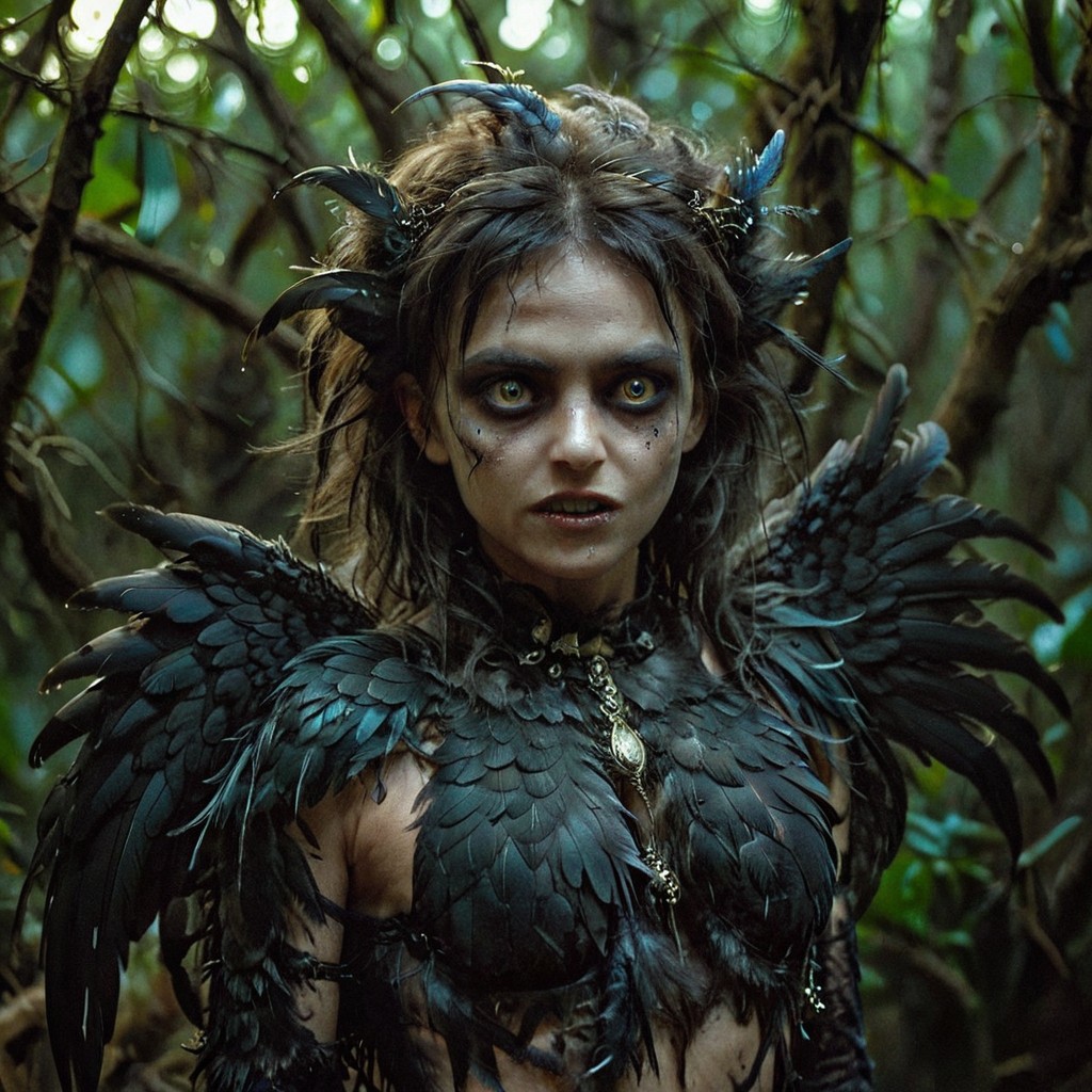 dim lighting, moonlit, harpy girl, perching on branch, feathered skin, sickly skin, ((dirty skin)), (((very sharp teeth))), bone jewelry, black eyes, tangled stringy hair, ((big feathered wings on back:2)), feathers in hair, ((clothed chest:1.2)), menacing expression, inhuman, monstrous, swampy