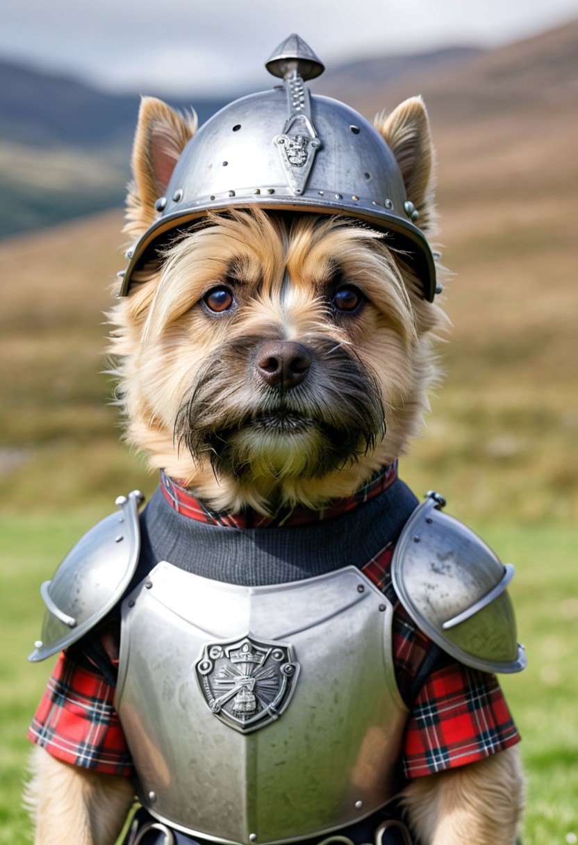 ultra realistic image of a cairn terrier wearing Scottish knight armor and a helmet, kilt, highlands