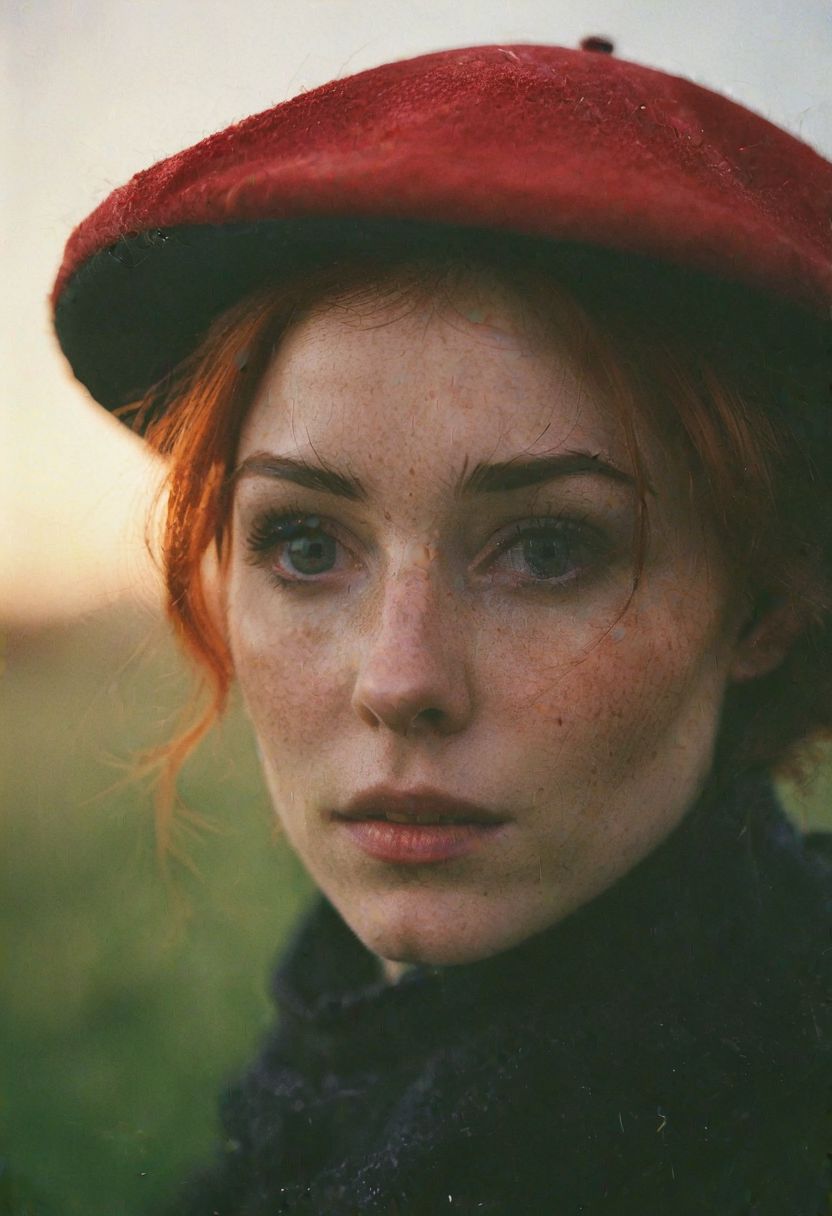 portrait of a irish girl, idyllic, cute, suggestive, melancholic, high detalied natural skin, short red hair, freckles, bare shoulders, like (Sarah Bolger1.2), red velvet hat, Kodak Portra 600 color film, professional, masterpiece, 8k, hyperrealistic, low angle shoot, rim lighting, natural soft sunset light, trending of Artstation