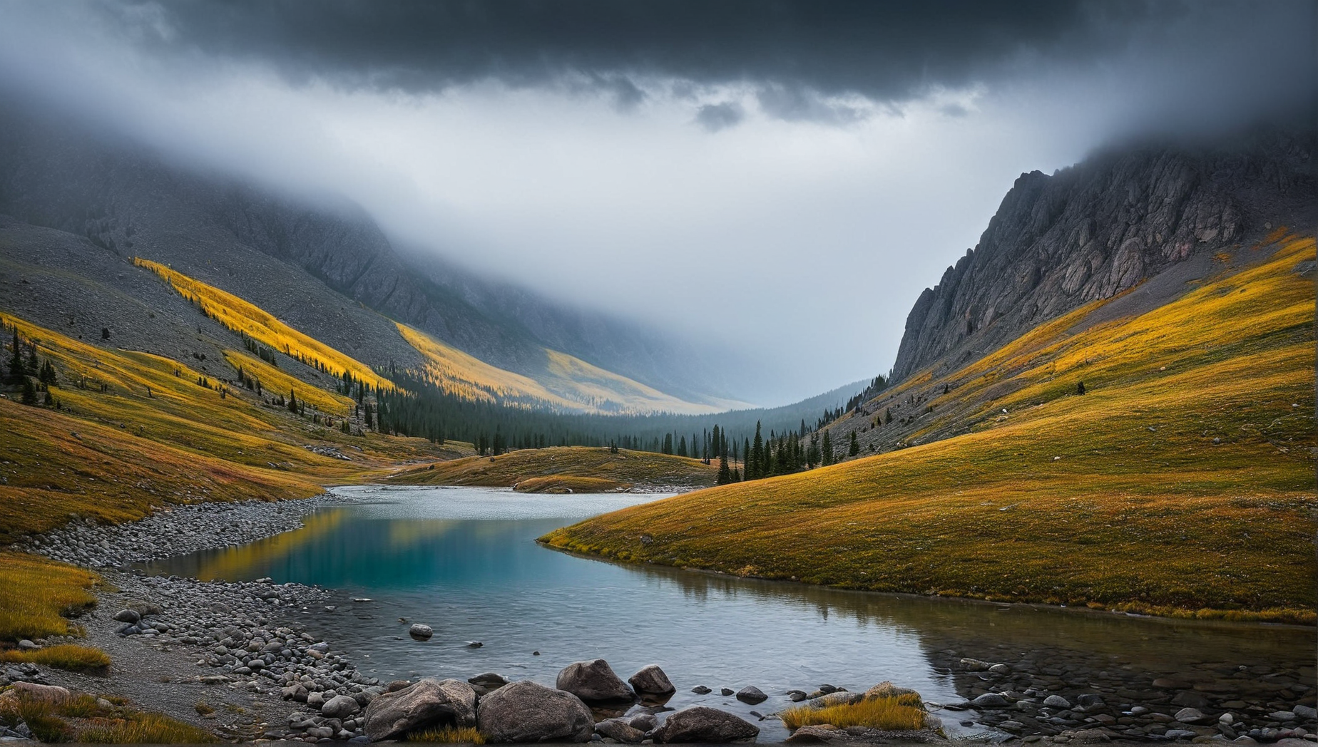 photo, Rocky Mountains, (misty:1.5), rain, creepy atmosphere, dramatic light, (darkness:2.5), ((multi-color hues:1.5)), great detail, 8k, darkness, water, reflections, vivid color, photo quality, photography, <lora:Colorful_Crayons_Pony:1> colorful,