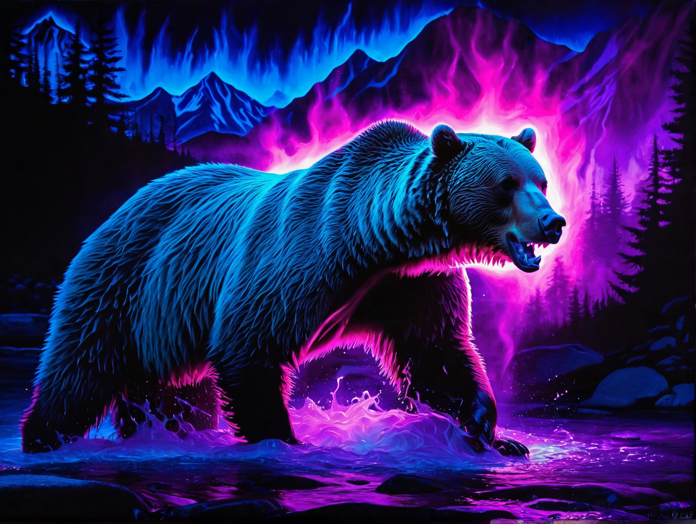 black light painting on black velvet, Rocky Mountains, attacking Grizzly bear, (misty:1.5), dramatic light, neon colors, great detail, 8k, water, reflections, vivid colors,