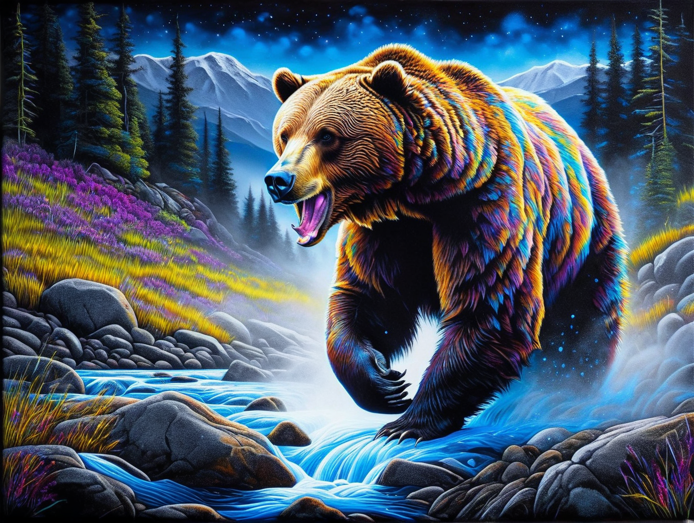 black light painting on black velvet, Rocky Mountains, attacking Grizzly bear, (misty:1.5), dramatic light, great detail, 8k, water, reflections, vivid colors, <lora:Colorful_Crayons_Pony:1> colorful,