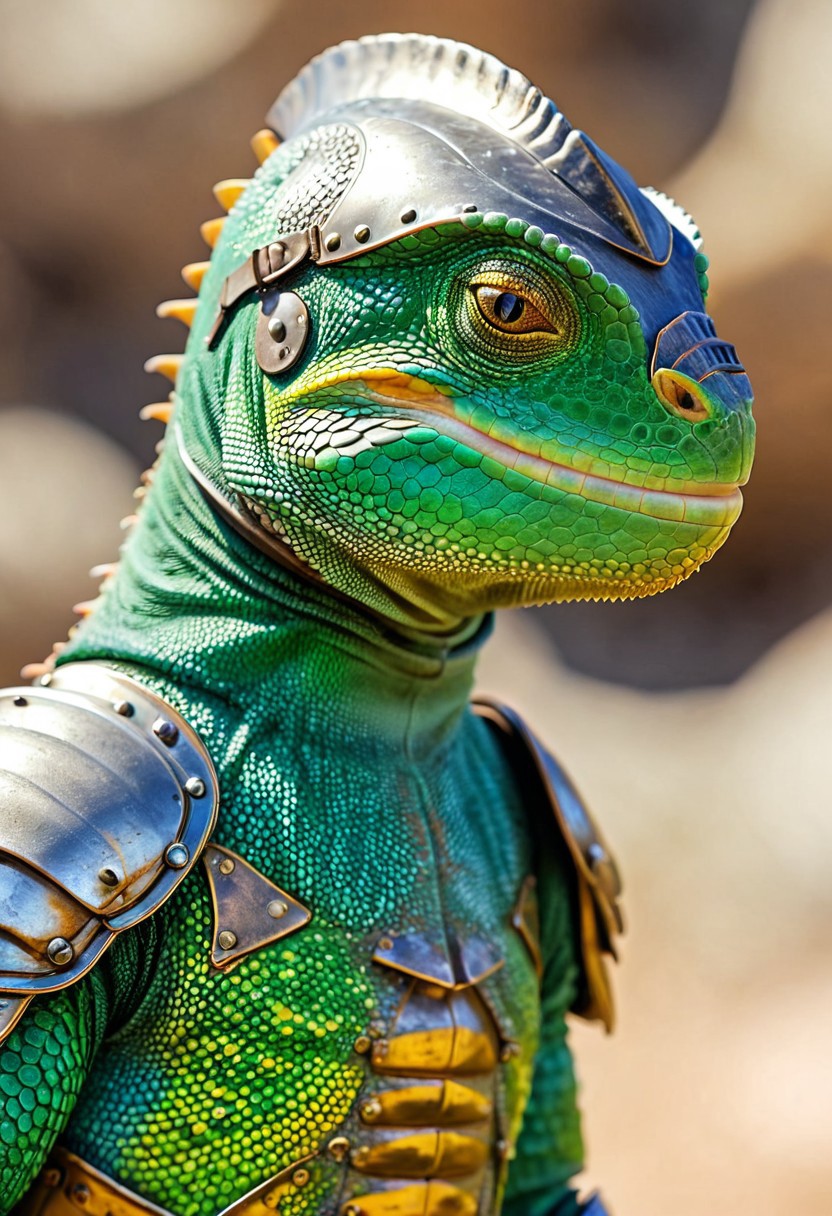 ultra realistic image of an lizard wearing gladiator armor and a helmet