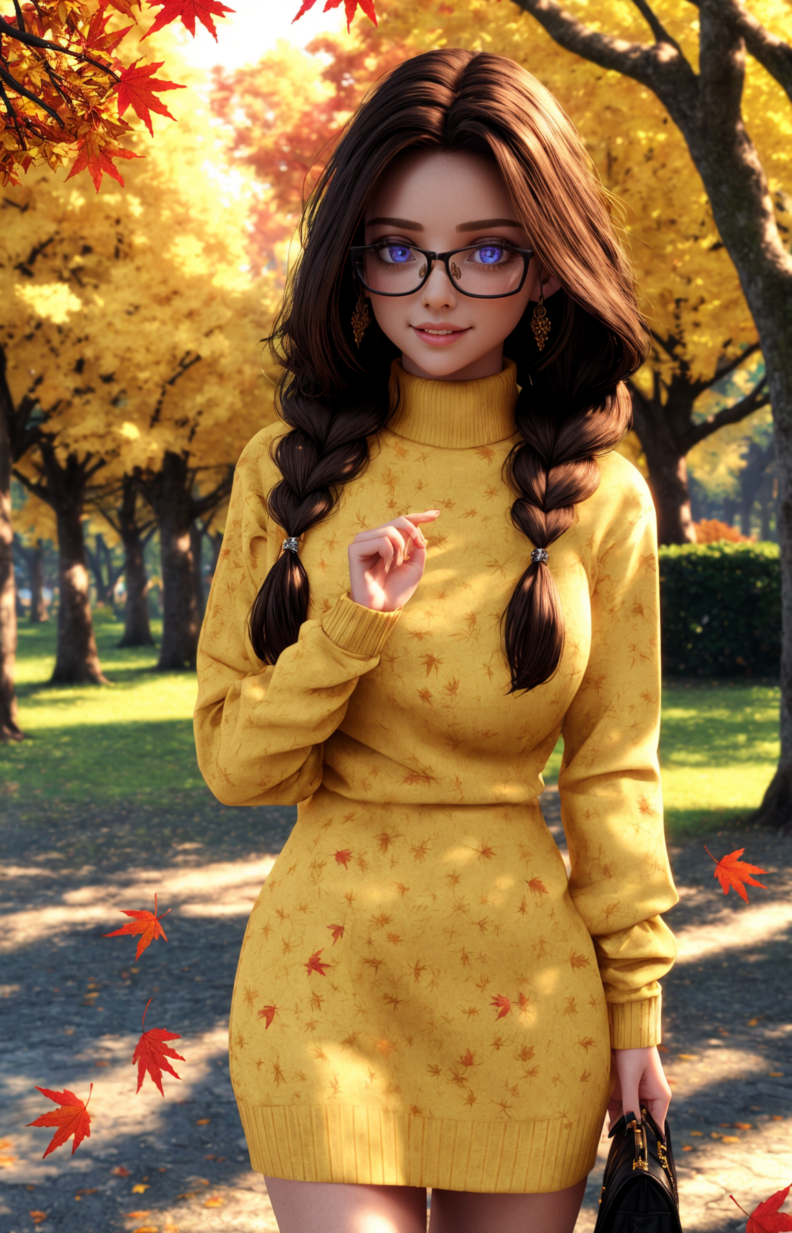 3D, high quality, girl, standing, dynamic pose, yellow sweater dress, glasses, long braided hair, detailed face, expressive eyes, park setting, autumn leaves, soft sunlight, perfect anatomy, detailed hands, vibrant colors <lora:add_detail:0.4> <lora:backlight_slider_v10:-1>