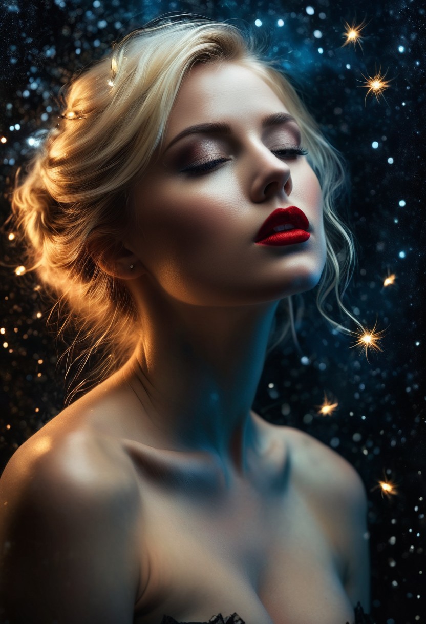 Ethereal beautiful stunning , starry night sky, fireflies, magical mystical enchanting fantasy dreamlike background, gritty grunge antique style, Cinematic, hyperrealistic, HDR ,Realism portrait styles, Classical, gothic-style photograph featuring a sublime Head and torso portrait of a magnificent woman with Blond hair, pale skin and dark red lips,Color photograph, in the style of realism, full body photograph, emotional and dramatic scenes, Style of Kriengin, Brandon Wolfel, sharp focus, style of Jay Anacleto, Esao Andrews, realism, professional photography, complex background,with a natural aesthetic, mystic introspection,3d textures, atmospheric elements by Bill Carman, Dave McKean, ng_deepnegative_v1_75t, negative_hand