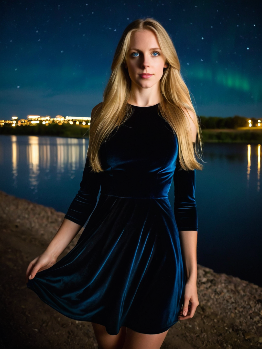 cute young woman, with symmetric eyes, even eyes, beautiful eyes, next to Minnesota river at night, aurora borealis, seductive expression, medium breasts, blonde hair, long hair, dark blue eyes, short flowing black velvet dress, black velvet dress, sleeveless dress, silhouette photography, great lighting, sexy pose, <lora:detailed_hands:1> hand
