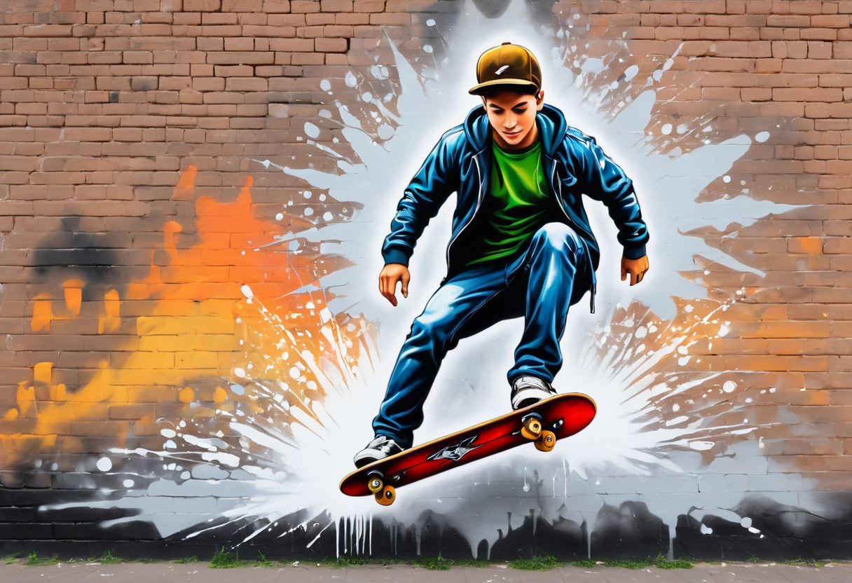 #graffiti, #graffiti on a brick wall, #aerosol painting on a wall, #colored graffiti, #Street art, #Aerosol paint, #Street canvas, #Graffiti artist, #Graffiti art, #Aerosol art, There is (((ivy: 1.3))) growing on a brick wall. (((Aerosol cans: 1.3))). Awesome dynamic acrylic painting of a guy on a skateboard, in the air, action painting, jumping, heavy rain, lots of flying liquid paint, textured impasto, thick and heavy brushstrokes, b-boy